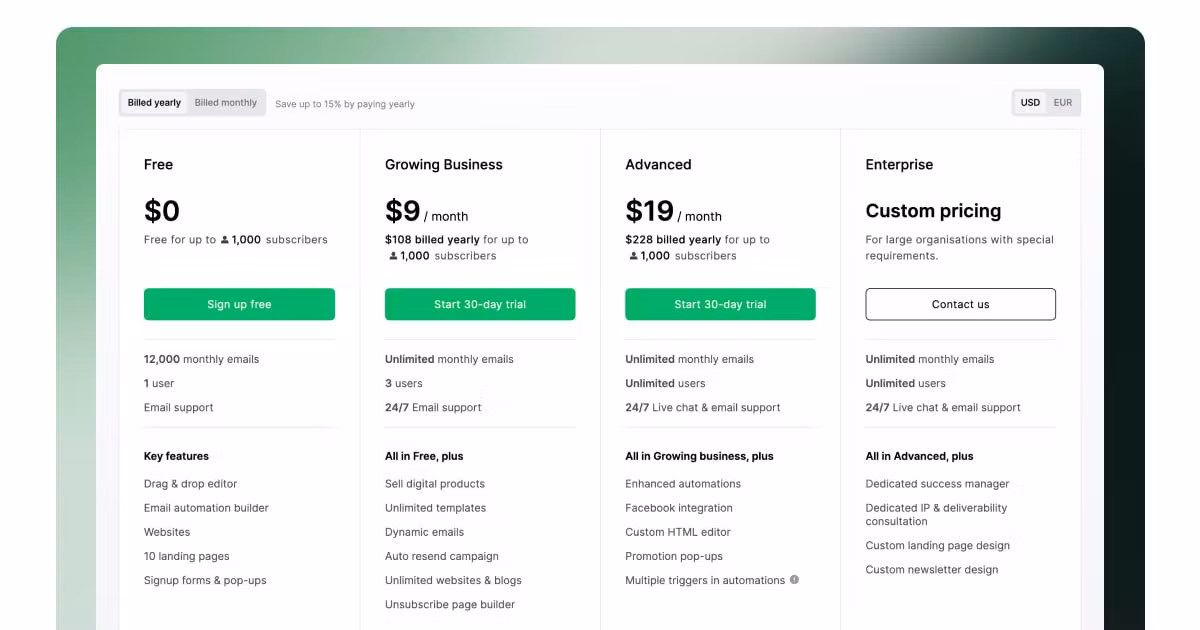 Lightweight email marketing platform with automations, landing pages, and forms.