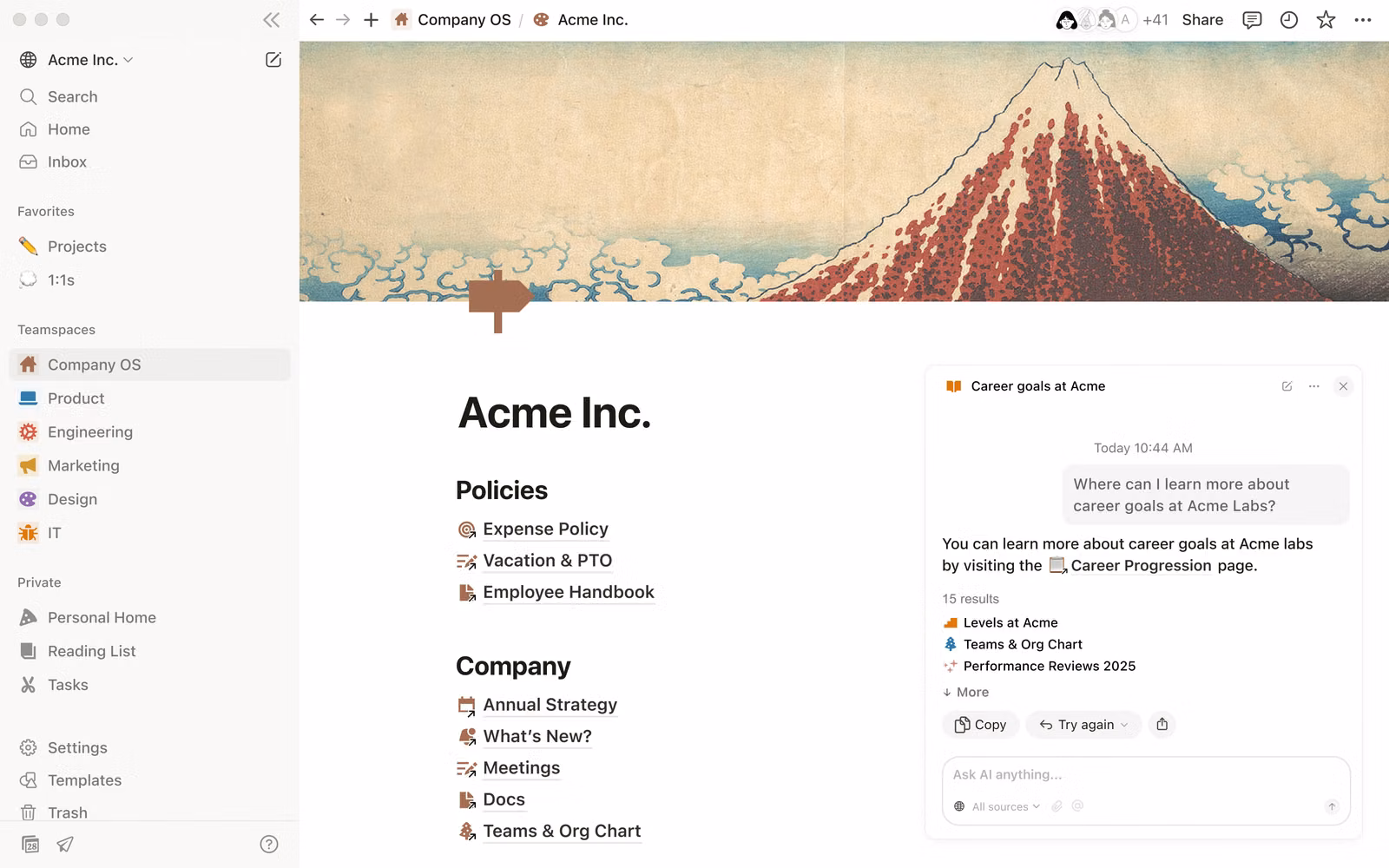 Connected workspace for docs, knowledge, projects, search, and built-in AI.