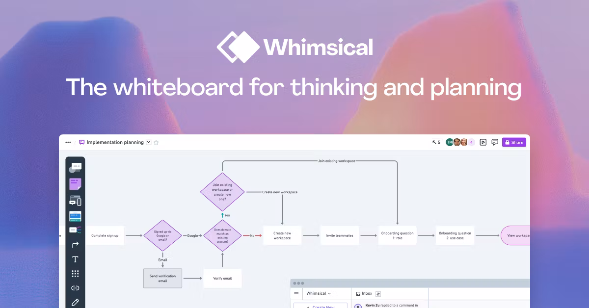 Whimsical gives teams a fast, lightweight environment for flowcharts, wireframes, mind maps, whiteboards, and docs. It is especially useful for product, design, and operations teams that want visual thinking tools without the heavier feel of enterprise whiteboard suites.